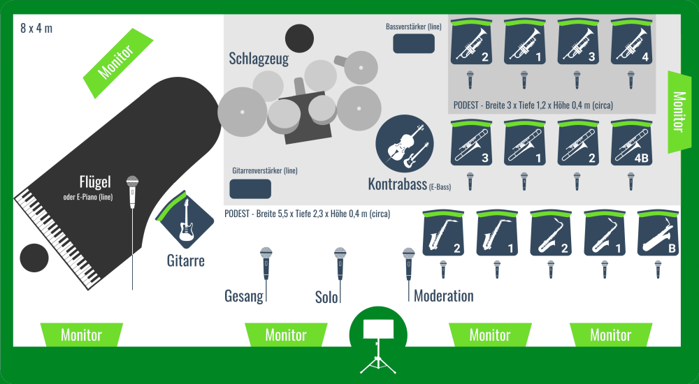 Sollten Sie uns aber eine Bühne zur Verfügung stellen, so wären die Mindestmaße: 6m x 3m, mit Flügel 8m x 4m.